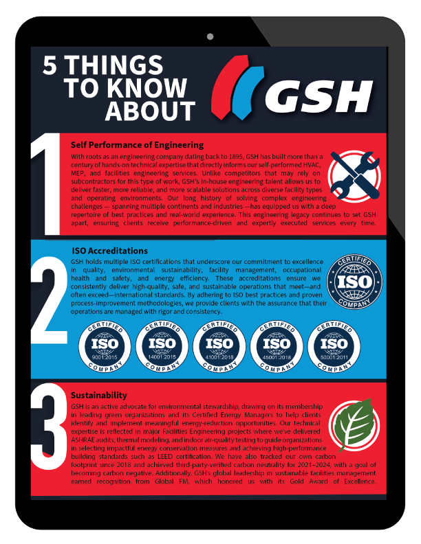GSH Group serves the facilities management needs of commercial buildings, data centers, critical environments, government facilities, airports and transportation centers, prisons, educational institutions, retail and financial institutions with a full range of products and services.